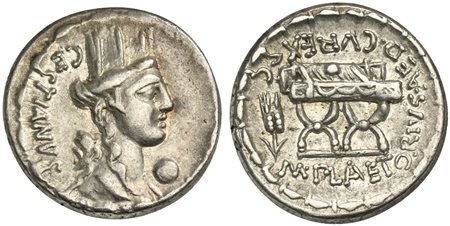 M. Plaetorius M.f. Cestianus, Denarius, Rome, 57 BC. AR (g 3,93; mm 19; h 7). Turreted and draped bust of Cybele r.; globe below chin, forepart of lion behind; CESTIANVS behind, Rv. Curule chair; grain-ear to l.; M•PLAETORIVS•AED•CVR•EX•S•C. Crawford 409/2; Plaetoria 3; Sydenham 808. Good very fine
