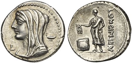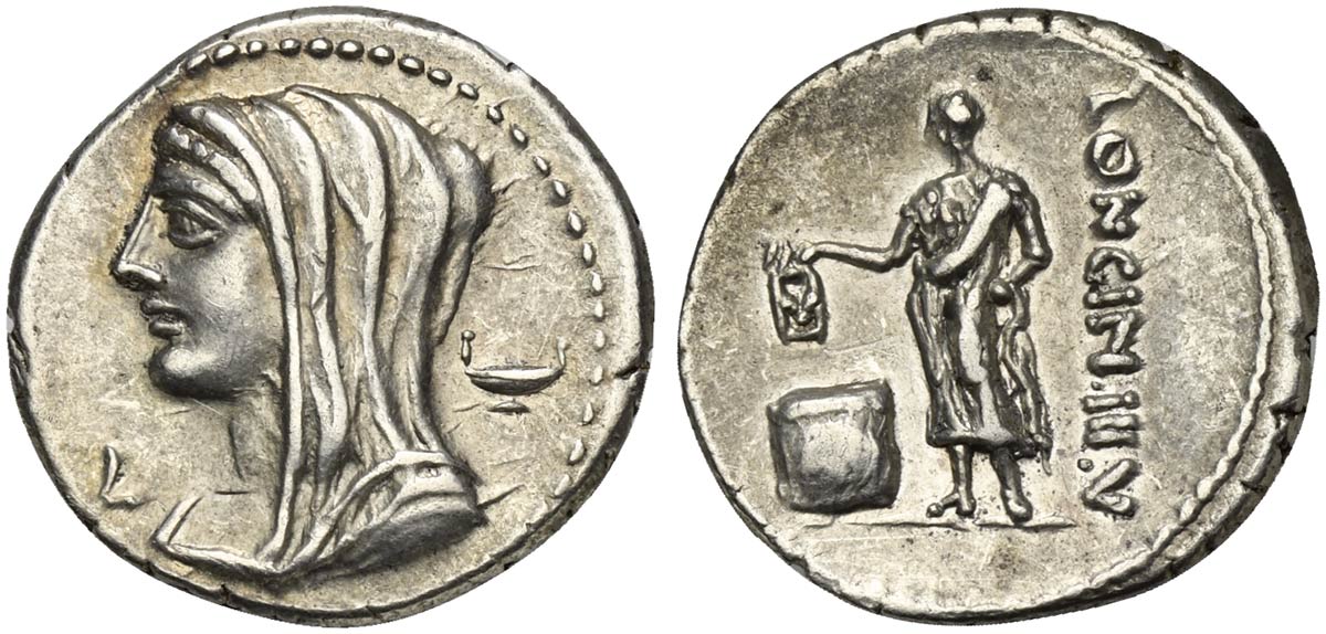 L. Cassius Longinus, Denarius, Rome, 60 BC. AR (g 3,92; mm 20; h 8). Veiled and draped bust of Vesta l.; L to l., calix to r., Rv. Voter standing l., dropping tablet into cista to l.; LONGIN•III•V to r. Crawford 413/1; Cassia 10; Sydenham 935. Extremely fine
