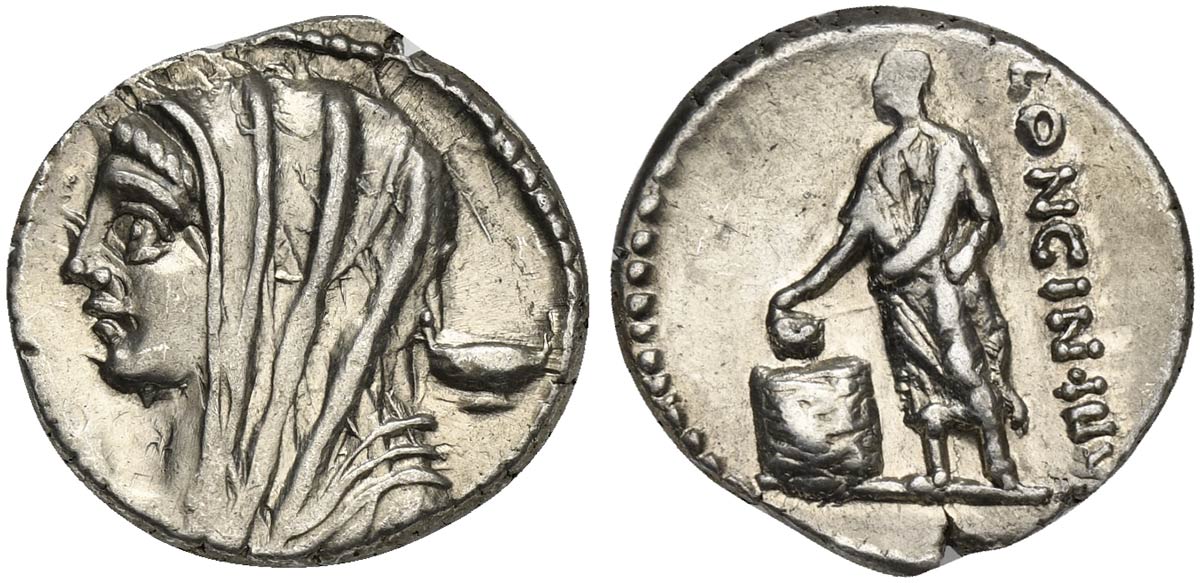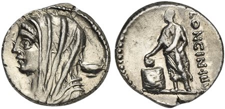 L. Cassius Longinus, Denarius, Rome, 60 BC. AR (g 3,72; mm 18; h 6). Veiled and draped bust of Vesta l.; I to l., calix to r., Rv. Voter standing l., dropping tablet into cista to l.; LONGIN•III•V to r. Crawford 413/1; Cassia 10; Sydenham 935. Good very fine
