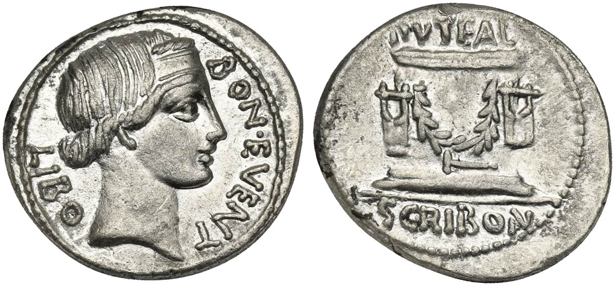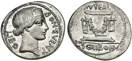 L. Scribonius Libo, Denarius, Rome, 62 BC. AR (g 3,82; mm 21; h 5). Diademed head of Bonus Eventus r.; LIBO behind, BON•EVENT before, Rv. Puteal Scribonianum (Scribonian wellhead), decorated with garland and two lyres; hammer at b