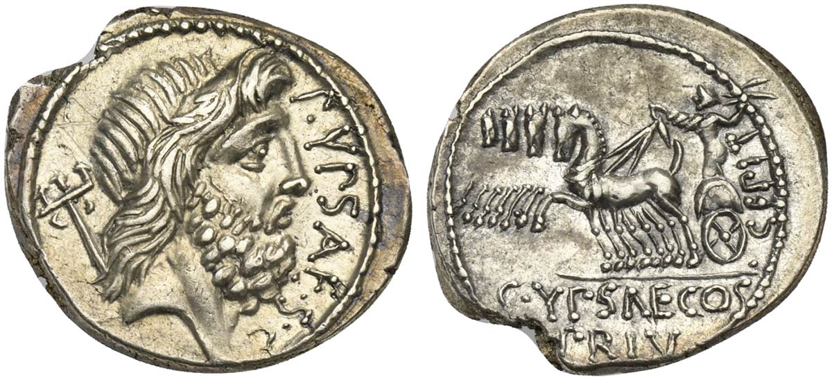 P. Plautius Hypsaeus, Denarius, Rome, 57 BC. AR (g 3,79; mm 20; h 6). Head of Neptune r.; trident behind; P•YPSAE•S•C before, Rv. Jupiter driving galloping quadriga l., holding reins and hurling thunderbolt; C•YPSAE•COS / PRIV bel