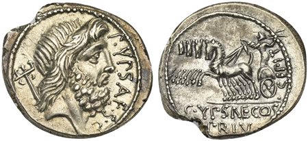 P. Plautius Hypsaeus, Denarius, Rome, 57 BC. AR (g 3,79; mm 20; h 6). Head of Neptune r.; trident behind; P•YPSAE•S•C before, Rv. Jupiter driving galloping quadriga l., holding reins and hurling thunderbolt; C•YPSAE•COS / PRIV below, CEPIT behind. Crawford 420/1a; Plautia 11; Sydenham 910. Extremely fine