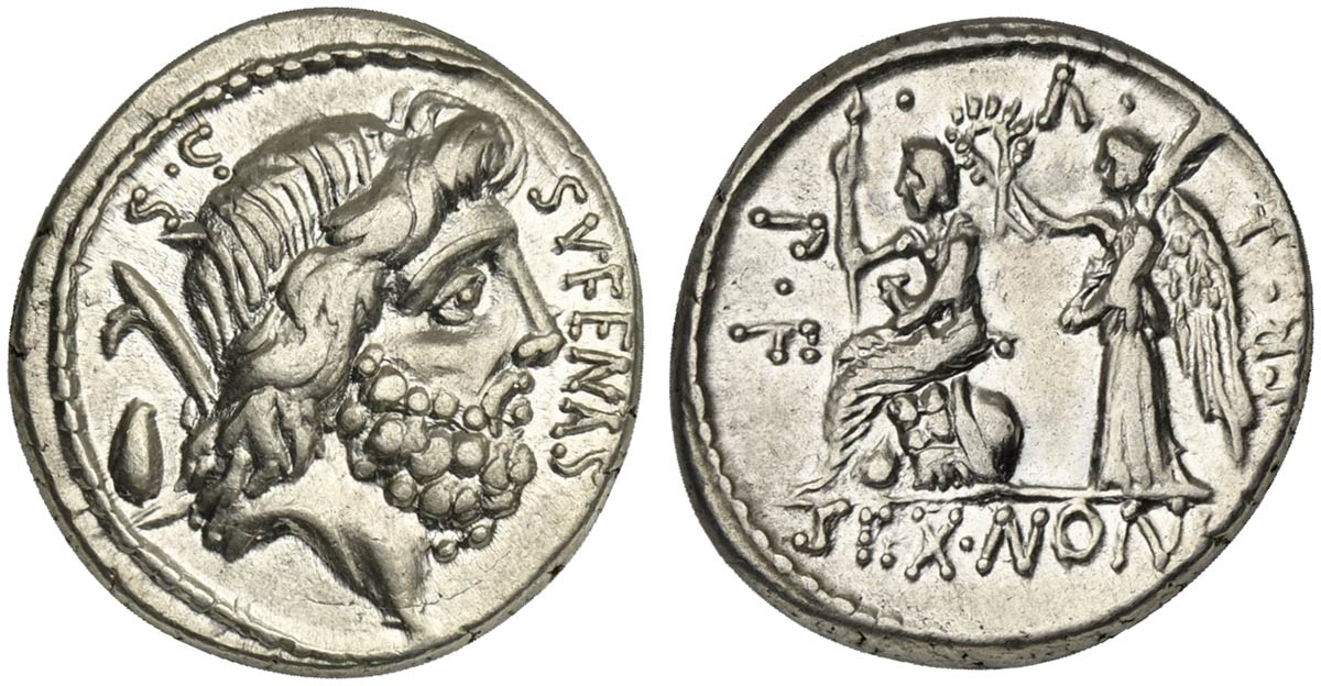 M. Nonius Sufenas, Denarius, Rome, 57 BC. AR (g 3,78; mm 18; h 5). Head of Saturn r.; behind, harpa above baetyl; S•C behind, SVFENAS before, Rv. Roma seated l. on pile of arms, holding spear and sword, being crowned by Victory st
