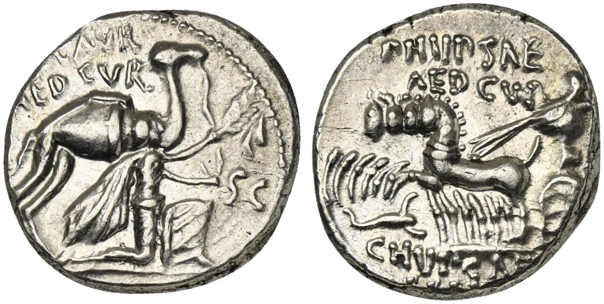M. Aemilius Scaurus and Pub. Plautius Hypsaeus, Denarius, Rome, 58 BC. AR (g 3,94; mm 18; h 10). Nabatean king Aretas kneeling r., holding reins and olive branch before camel standing r.; [M•S]CAVR AED•CVR above, EX-S•C flanking, Rv. Jupiter driving quadriga l., holding reins and hurling thunderbolt; scorpion below horses; P•HVPSAE AED•CVR above, C•HVPSAE•[COS] below. Good very fine