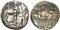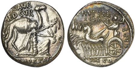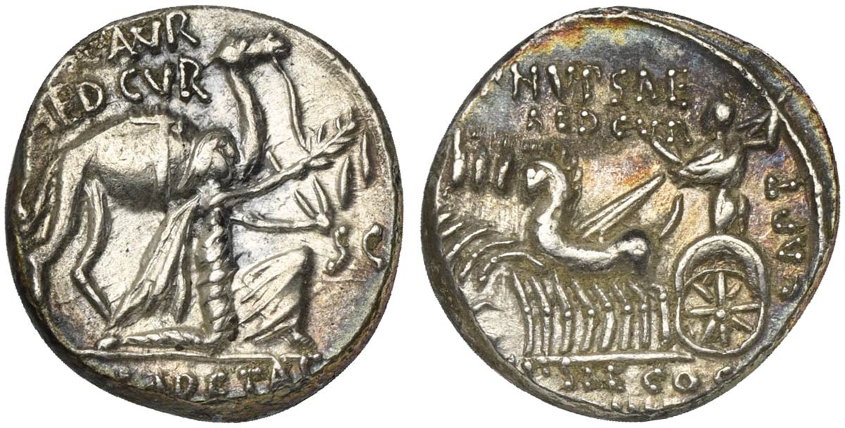 M. Aemilius Scaurus and Pub. Plautius Hypsaeus, Denarius, Rome, 58 BC. AR (g 3,83; mm 17; h 4). Nabatean king Aretas kneeling r., holding reins and olive branch before camel standing r.; [M]•SCAVR AED•CVR above, [EX]-S•C flanking, [REX]•ARETAS in exergue, Rv. Jupiter driving quadriga l., holding reins and hurling thunderbolt; scorpion below horses; P•HVPSAE AED•CVR above, CAPT to r., [C•HV]PSAE•COS [PREIVE] below. Crawford 422/1b; Aemilia 8; Sydenham 913. Toned, good very fine