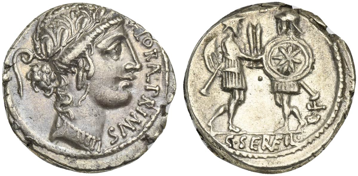C. Servilius C.f., Denarius, Rome, 53 BC. AR (g 3,68; mm 18; h 7). Head of Flora r., wearing wreath of flowers; lituus to l.; FLOR(AL)•PRI(MV)S, Rv. Two warriors facing each other, each holding shield and sword; C•SE(RVE)IL in exe