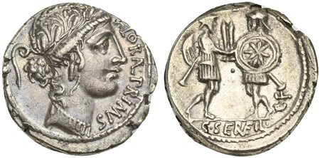 C. Servilius C.f., Denarius, Rome, 53 BC. AR (g 3,68; mm 18; h 7). Head of Flora r., wearing wreath of flowers; lituus to l.; FLOR(AL)•PRI(MV)S, Rv. Two warriors facing each other, each holding shield and sword; C•SE(RVE)IL in exergue, C•F to r. Crawford 423/1; Servilia 15; Sydenham 890. Good very fine