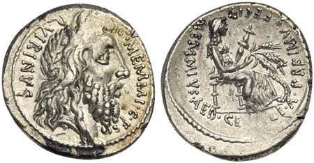 C. Memmius C.f., Denarius, Rome, 56 BC. AR (g 3,88; mm 20; h 6). Laureate and bearded head of Quirinus r.; QVIRINVS behind, C•MEMMI•C•F before, Rv. Ceres seated r., holding torch and three stalks of grain; erect serpent to r.; MEM