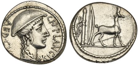 Cn. Plancius, Denarius, Rome, 55 BC. AR (g 3,90; mm 19; h 5). Female head (Diana Planciana?) r., wearing causia; CN•PLANCIVS AED•CV[R•S•C] around, Rv. Cretan goat standing r.; bow and quiver to l. Crawford 432/1; Plancia 1; Sydenham 933. Good very fine