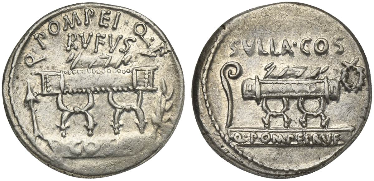 Q. Pompeius Rufus, Denarius, Rome, 54 BC. AR (g 3,77; mm 18; h 7). Curule chair flanked by arrow and laurel branch; Q•POMPEI•Q•F / RVFVS above, COS on tablet below, Rv. Curule chair flanked by lituus and wreath; SVLLA•COS above, Q