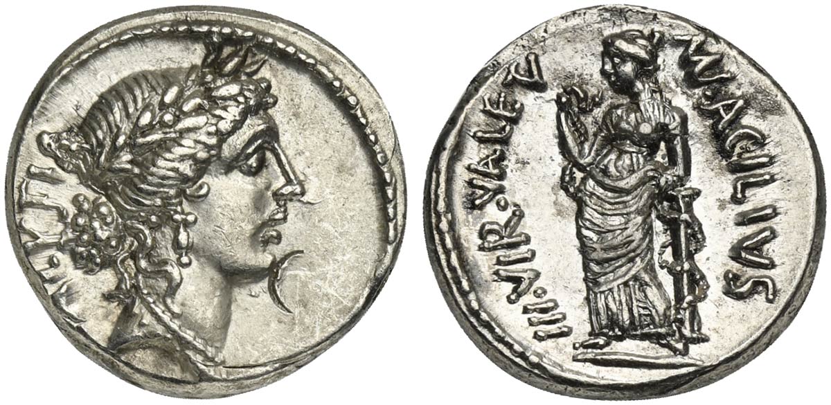 Man. Acilius Glabrio, Denarius, Rome, 49 BC. AR (g 3,80; mm 17; h 6). Laureate head of Salus r.; behind, SALVTIS upwards, Rv. Salus standing l. against column, holding serpent; (MN)•ACILIVS to r., III•VIR•VALE(TV) to l. Crawford 4