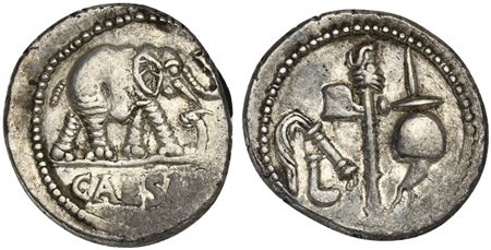 Julius Caesar, Denarius, military mint traveling with Caesar, April-August 49 BC. AR (g 3,87; mm 19; h 3). Elephant advancing r., trampling on horned serpent; CAESA[R] in exergue, Rv. Emblems of the pontificate: simpulum, aspergillum, securis, and apex. Crawford 443/1; RSC 49; Sydenham 1006. Very fine