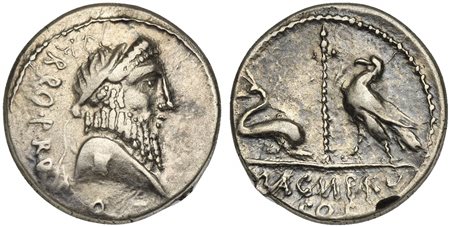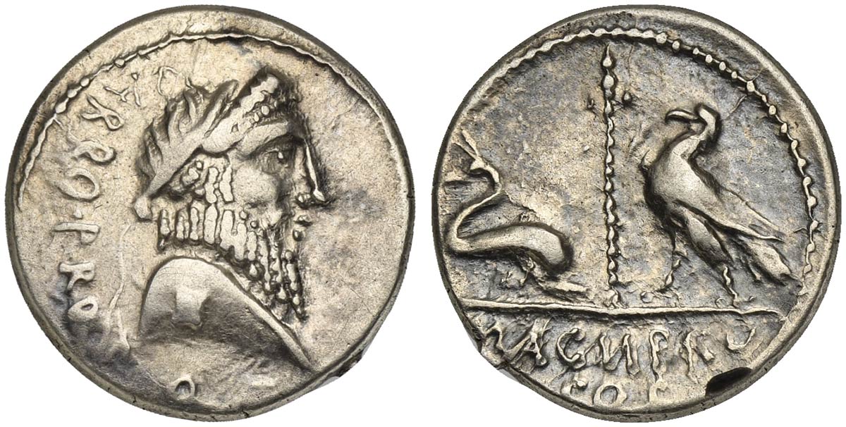 Cnaeus Pompeius Magnus (Pompey the Great), Denarius, Uncertain mint in Greece; Varro, proquaestor, Spring 48 BC. AR (g 3,87; mm 19; h 11). Diademed terminal bust of Jupiter r.; VARRO•PRO•Q behind, Rv. Vertical sceptre between dolphin, on l., and eagle, on r.; MAGN•PRO COS in exergue. Crawford 447/1a; RSC 3; Sydenham 1033. Toned, good very fine