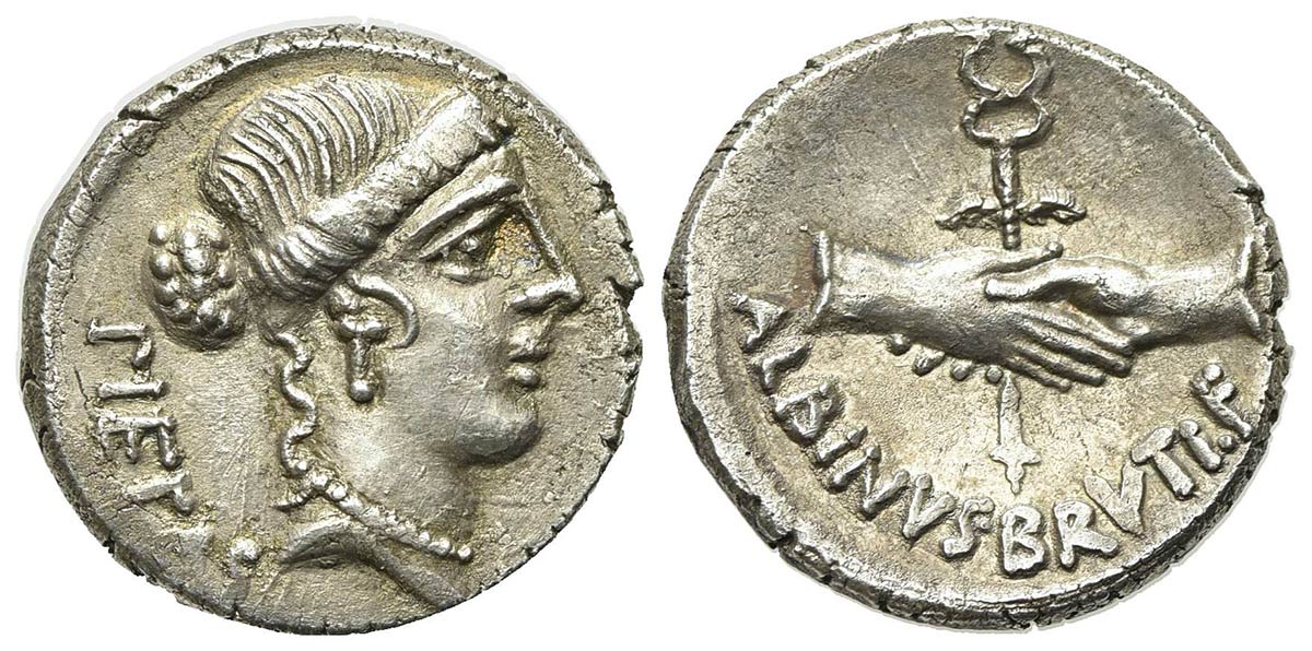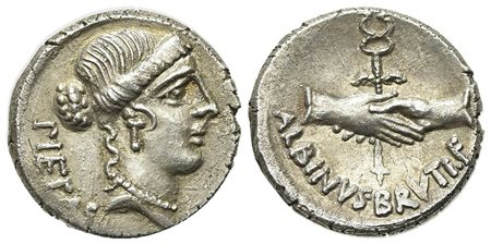 Albinus Bruti f., Denarius, Rome, 48 BC. AR (g 3,88; mm 17; h 6). Bare head of Pietas r.; PIETAS behind, Rv. Clasped hands holding winged caduceus; ALBINVS BRVTI F below. Crawford 450/2; Postumia 10; Sydenham 942. Good very fine