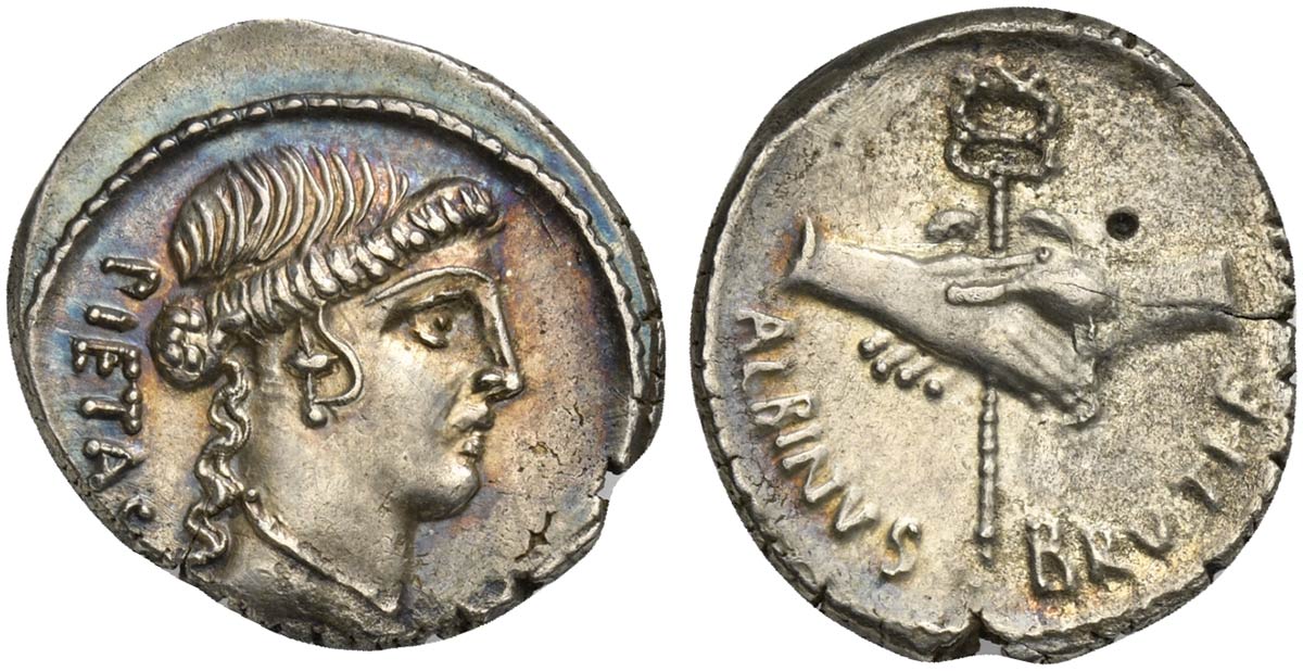 Albinus Bruti f., Denarius, Rome, 48 BC. AR (g 3,82; mm 19; h 2). Bare head of Pietas r.; PIETAS behind, Rv. Clasped hands holding winged caduceus; ALBINVS BRVTI F below. Crawford 450/2; Postumia 10; Sydenham 942. Iridescent patina, flan-crack, good very fine