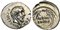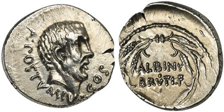 Albinus Bruti f., Denarius, Rome, 48 BC. AR (g 3,98; mm 20; h 10). Bare head of the consul Aulus Postumius Albinus r.; A•POSTVMIVS•COS around, Rv. ALBINV/BRVTI • F in two lines within wreath of grain ears. Crawford 450/3b; Postumi