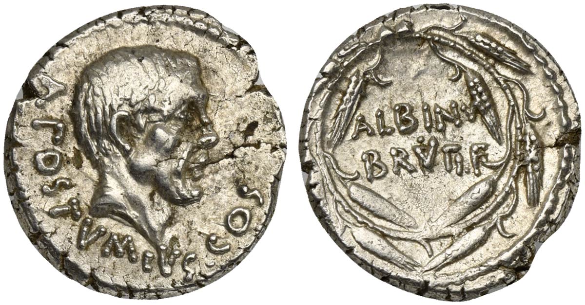 Albinus Bruti f., Denarius, Rome, 48 BC. AR (g 3,65; mm 18; h 6). Bare head of the consul Aulus Postumius Albinus r.; A•POSTVMIVS•COS around, Rv. ALBINV/BRVTI • F in two lines within wreath of grain ears. Crawford 450/3b; Postumia