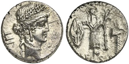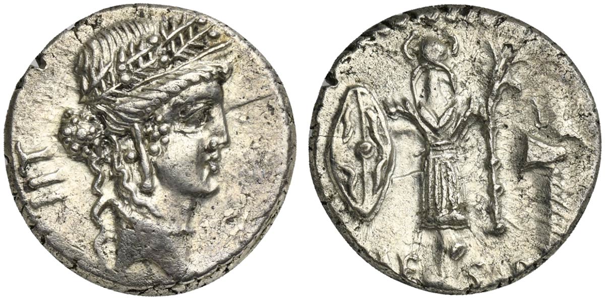 Julius Caesar, Denarius, military mint, late spring-early summer 48 BC. AR (g 3,89; mm 17; h 3). Diademed female head (Clementia?) r., wearing oak wreath; LII behind, Rv. Gallic trophy, holding oval shield and carnyx; securis surmounted by wolf’s head to r.; CAE-SAR below. Crawford 452/2; RSC 18; Sydenham 1009. Good very fine