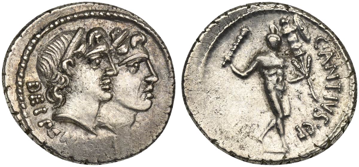 C. Antius C.f. Restio, Denarius, Rome, 47 BC. AR (g 4,02; mm 20; h 11). Jugate, diademed heads of Dei Penates r.; DEI•PEN[ATES], Rv. Hercules advancing r., holding club and trophy; C•ANTIVS•C•F. Crawford 455/2b; Antia 2; Sydenham