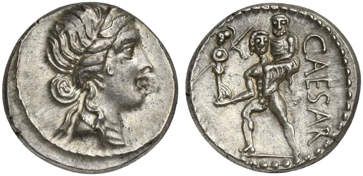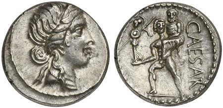 Julius Caesar, Denarius, military mint in North Africa, late 48-47 BC. AR (g 3,95; mm 17; h 6). Diademed head of Venus r., Rv. Aeneas advancing l., holding palladium and bearing Anchises on his shoulder; CAESAR to r. Crawford 458/