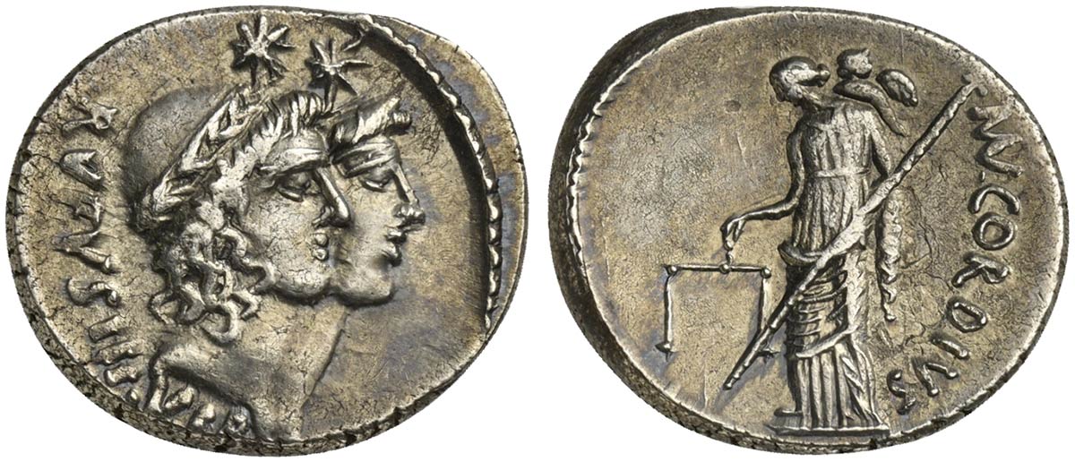 Mn. Cordius Rufus, Denarius, Rome, 46 BC. AR (g 3,84; mm 19; h 12). Conjoined heads of the Dioscuri r., wearing pilei with fillet surmounted by stars; RVFVS•IIIVIR, Rv. Venus Verticordia standing l., holding scales and sceptre; Cu