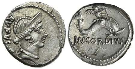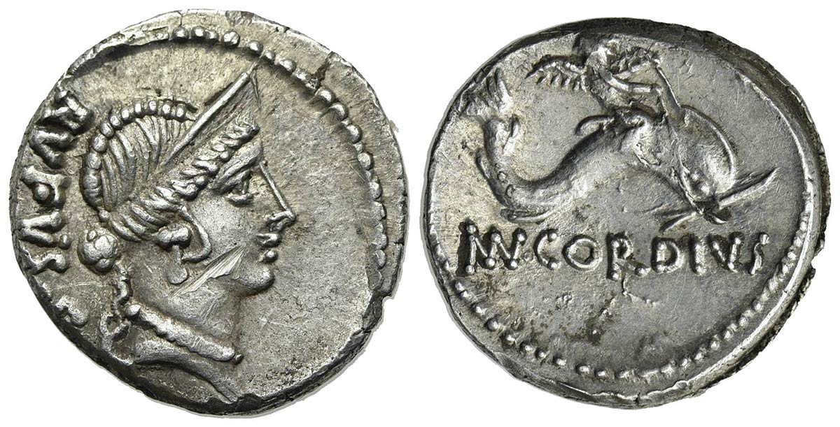 Mn. Cordius Rufus, Denarius, Rome, 46 BC. AR (g 3,83; mm 17.5; h 4). RVFVS S C, Diademed head of Venus r.; Rv. (MN) CORDIVS, Cupid riding dolphin r. Crawford 463/3; Sydenham 977; Cordia 3. Scratch on obv., otherwise good very fine