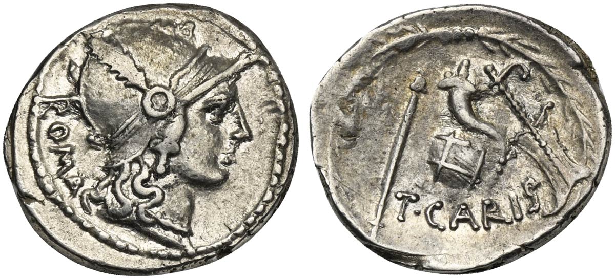 T. Carisius, Denarius, Rome, 46 BC. AR (g 4,13; mm 20; h 2). Head of Roma r., wearing ornate crested helmet; ROMA behind, Rv. Sceptre, cornucopia on globe, and rudder; all within laurel wreath; T•CARIS below. Crawford 464/3a; Cari