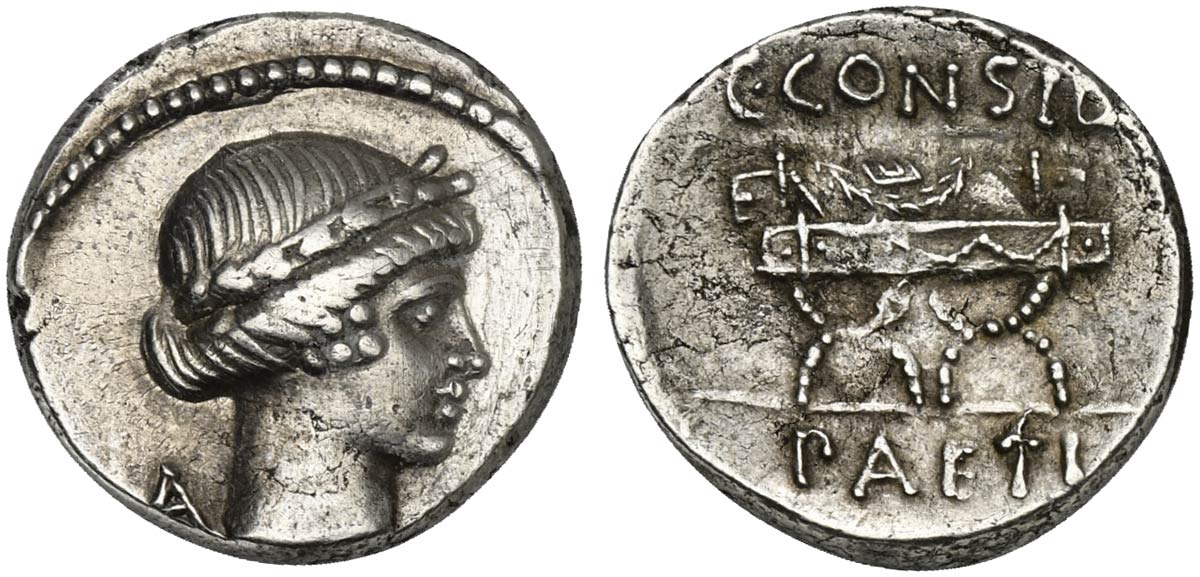C. Considius Paetus, Denarius, Rome, 46 BC. AR (g 3,81; mm 17; h 12). Laureate head of Apollo r.; A behind, Rv. Curule chair; C•CONSID[I] above, PAETI in exergue. Crawford 465/2a; Considia 2; Sydenham 991. Very fine