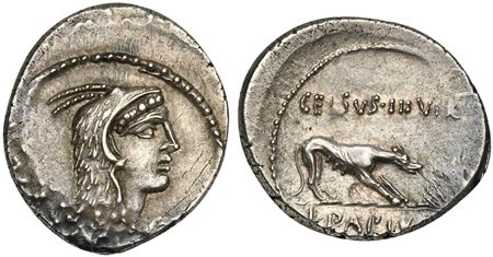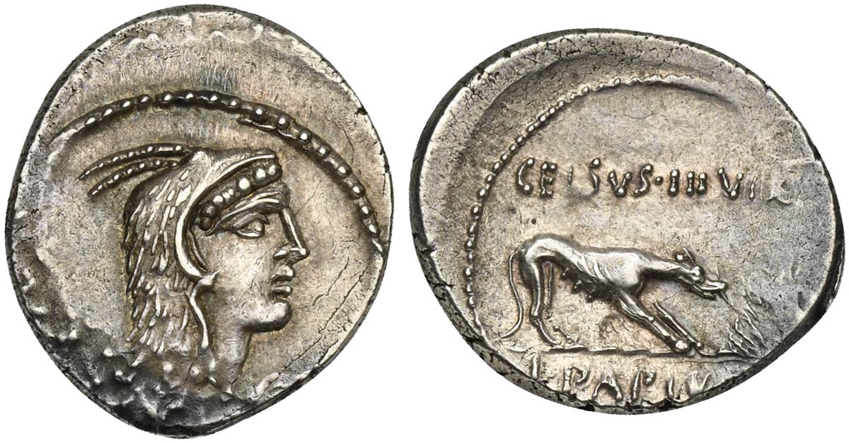 L. Papius Celsus, Denarius, Rome, 45 BC. AR (g 3,75; mm 20; h 3). Head of Juno Sospita r., wearing goat skin, Rv. She-wolf standing r., placing stick on fire; to r., [eagle standing l.], fanning flames; CELSVS•III•VIR above, L•PAP