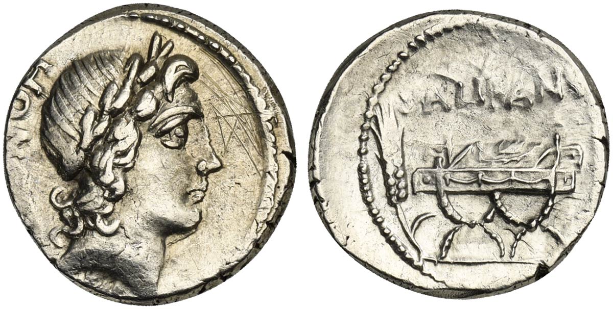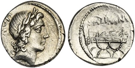 Lollius Palicanus, Denarius, Rome, 45 BC. AR (g 3,75; mm 18; h 4). HON[ORIS], Laureate head of Honoris r.; Rv. PALIKANVS, Curule chair between two grain-ears. Crawford 473/2; Sydenham 961; Lollia 1. Scratches, very fine