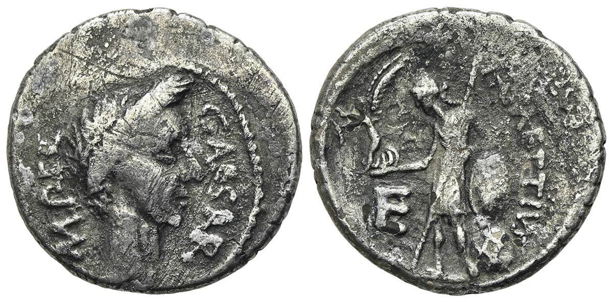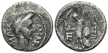 Julius Caesar, Denarius, Rome, March-April 44 BC. AR (g 3,28; mm 18,5; h 11). IMPER CAESAR, Laureate head r.; Rv. M METTIVS, Venus standing l., holding Victory and sceptre, leaning on shield set on globe; E to l. Crawford 480/17; Sydenham 1055; RSC 35. Scratches, good fine