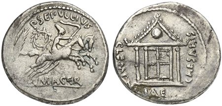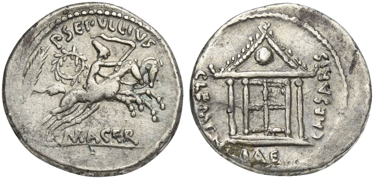 Julius Caesar, Denarius, P. Sepullius Macer, moneyer, Rome, April-May 44 BC. AR (g 3,46; mm 19; h 11). Tetrastyle temple with globe in pediment; CLEMENTIAE CAESARIS around, Rv. Desultor wearing conical cap and holding whip, r. on horseback, second horse behind; palm frond and wreath to l.; P•SEPVLLIVS above, MACER below. Crawford 480/21; RSC 44; Sydenham 1076. Very fine