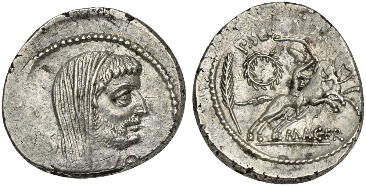 Mark Antony, Denarius, Rome, April-May 44 BC. AR (g 4,12; mm 20; h 3). P. Sepullius Macer, moneyer. Veiled head r., wearing beard; capis to l., lituus to r., Rv. Desultor (horseman who leaps from one horse to another), wearing con