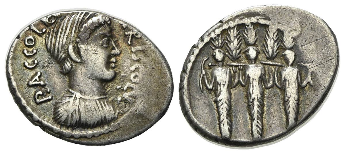 P. Accoleius Lariscolus, Denarius, Rome, 41 BC. AR (g 3,83; mm 19,5; h 6). Draped bust of Diana Nemorensis r.; P•ACCOLEIVS behind, LARISCOLVS before, Rv. Triple cult statue of Diana Nemorensis facing, supporting on their hands and