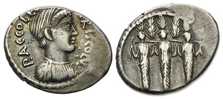 P. Accoleius Lariscolus, Denarius, Rome, 41 BC. AR (g 3,83; mm 19,5; h 6). Draped bust of Diana Nemorensis r.; P•ACCOLEIVS behind, LARISCOLVS before, Rv. Triple cult statue of Diana Nemorensis facing, supporting on their hands and shoulders a beam, above which are five cypress trees; the figure on l. holding poppy, that on r. holding lily. Crawford 486/1; Accoleia 1; Sydenham 1148. Scarce, area of flatness, good very fine