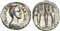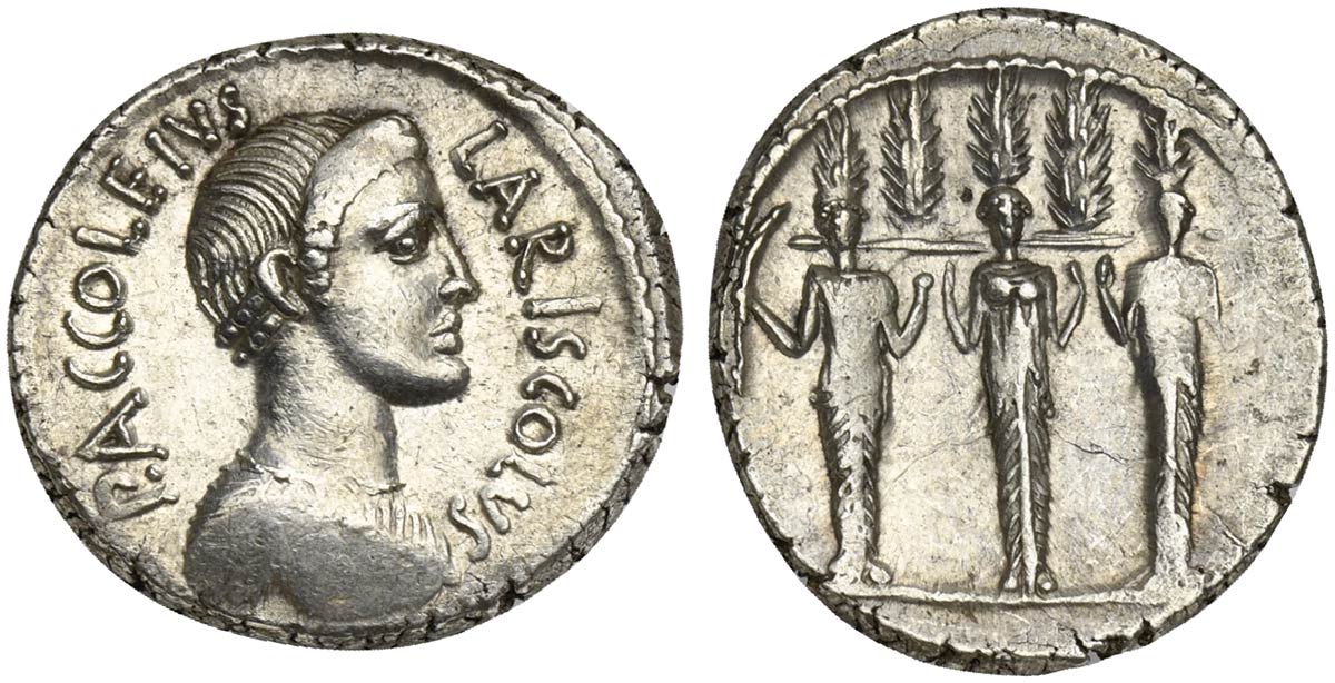 P. Accoleius Lariscolus, Denarius, Rome, 41 BC. AR (g 3,94; mm 19; h 3). Draped bust of Diana Nemorensis r.; P•ACCOLEIVS behind, LARISCOLVS before, Rv. Triple cult statue of Diana Nemorensis facing, supporting on their hands and s