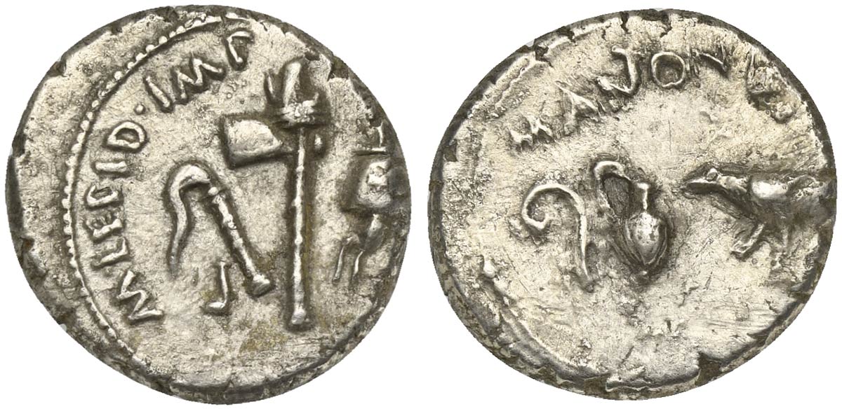 Mark Antony and Lepidus, Denarius, Gallia Transalpina, may-summer 43 BC. AR (g 3,78; mm 18; h 6). Lituus, capis and raven; M•A(NT)ON•IMP above, Rv. Emblems of the pontificate: simpulum, aspergillum, securis, and apex; M•LEPID•IMP