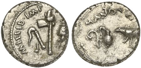Mark Antony and Lepidus, Denarius, Gallia Transalpina, may-summer 43 BC. AR (g 3,78; mm 18; h 6). Lituus, capis and raven; M•A(NT)ON•IMP above, Rv. Emblems of the pontificate: simpulum, aspergillum, securis, and apex; M•LEPID•IMP around. Crawford 489/2; RSC 2; Sydenham 1156. Rare, near very fine
