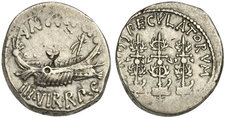 Mark Antony, Denarius, Patrae(?), Autumn 32-spring 31 BC. AR (g 3,85; mm 18; h 6). Praetorian galley r.; ANT•AVG above, III•VIR•R•P•C below, Rv. [CHO]RTIS • SPECVLATORVM, Three signa, each decorated with two wreaths and a prow. Crawford 544/12; RSC 6; Sydenham 1214. Bankers' marks, very fine