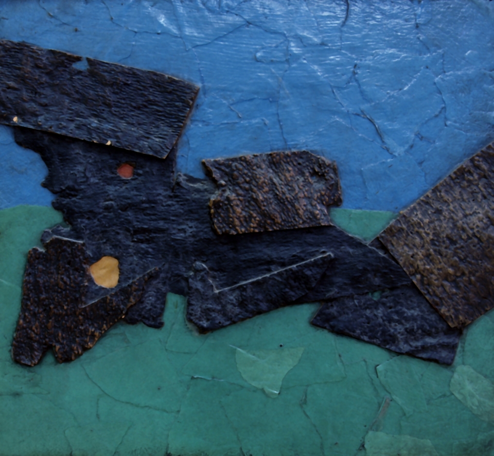 "Old fish" 1964 Collage su tavola cm. H: 46.00 L: 50.00 Firma ed anno al retro. Archivio delle opere di Roberto Crippa n. A7 su foto a firma di Gimmi Stefanini perito d'arte del tribunale di Milano.