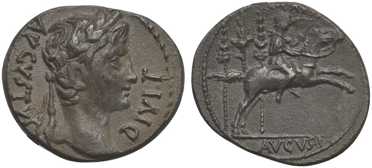 Augustus (27 BC-AD 14), Denarius, Lugdunum, 8 BC. AE (g 3,61; mm 19; h 6). AVGVSTVS DIVI F, Laureate head r., Rv. C CAES AVGVS F, Caius Caesar on horseback, galloping r., holding sword and reinst; to l., an aquila between two signa. RIC 199; RSC 40. Toned, good very fine