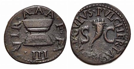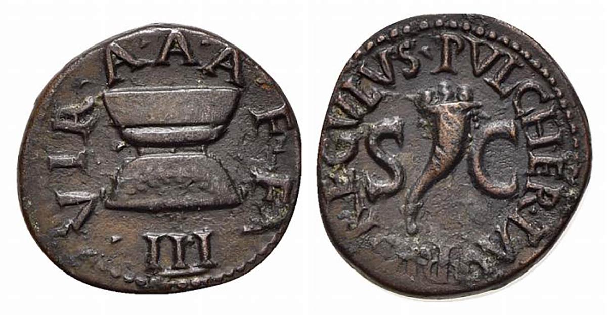 Augustus (27 BC-AD 14), Quadrans, Rome; Pulcher, Taurus, and Regulus, moneyers, 8 BC. AE (g 3,21; mm 18; h 3). PVLCHER TAVRVS REGVLVS, Cornucopia; Rv. III VIR A A A F F, Garlanded altar. RIC 425. Good very fine