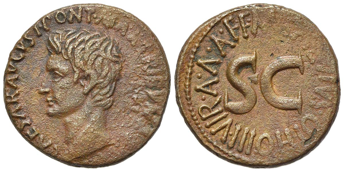 Augustus (27 BC-AD 14), As, Rome; M. Salvius Otho, moneyer, 7 BC. AE (g 11.36; mm 27; h 6). CAESAR AVGVST PONT MAX TRIBVNIC POT, Bare head l.; Rv. M SALVIVS OTHO IIIVIR AAAFF, Legend around large S • C. RIC 432. Brown patina, very