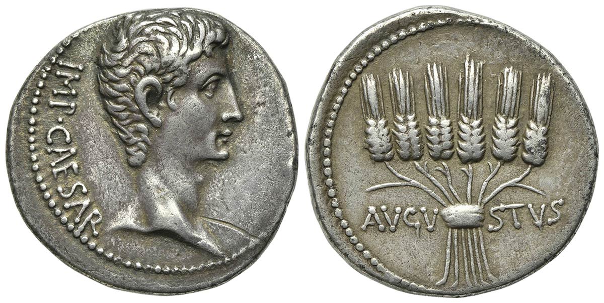 Augustus (27 BC - AD 14), Cistophoric Tetradrachm, Aeolis: Pergamum (?), 27-26 BC. AR (g 11,73; mm 25; h 12). IMP CAESAR, bare head of Octavian r., Rv. AVGV - STVS, six bunched corn-ears. RIC 494; C 32; RPC 2212. Cabinet tone, scratch on obverse otherwise extremely fine.