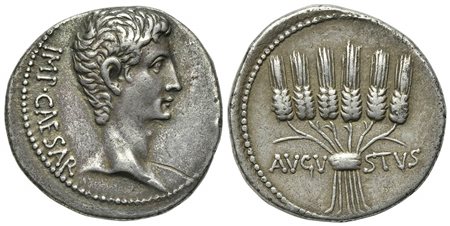 Augustus (27 BC - AD 14), Cistophoric Tetradrachm, Aeolis: Pergamum (?), 27-26 BC. AR (g 11,73; mm 25; h 12). IMP CAESAR, bare head of Octavian r., Rv. AVGV - STVS, six bunched corn-ears. RIC 494; C 32; RPC 2212. Cabinet tone, scr