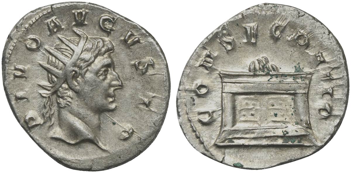 Divus Augustus (died AD 14), Antoninianus, Rome, mid AD 251. AR (g 3,75; mm 23; h 5). DIVO AVGVSTO, Radiate head r., Rv. CONSECRATIO, Lighted altar. RIC IV 78 (Decius); RSC –. Good very fine