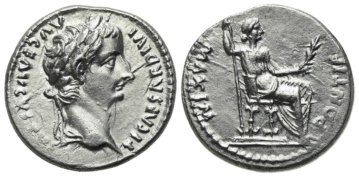 Lotto 1123 | Tiberius (14-37), Denarius, Lugdunum, ca. AD 14-37. AR (g 3,67; mm 18; h 12). TI CAESAR DIVI - AVG F AVGVSTVS, laureate head r., Rv. PONTIF - MAXIM, female figure (Livia - Pax) seated r., holding inverted spear and branch. RIC 28;