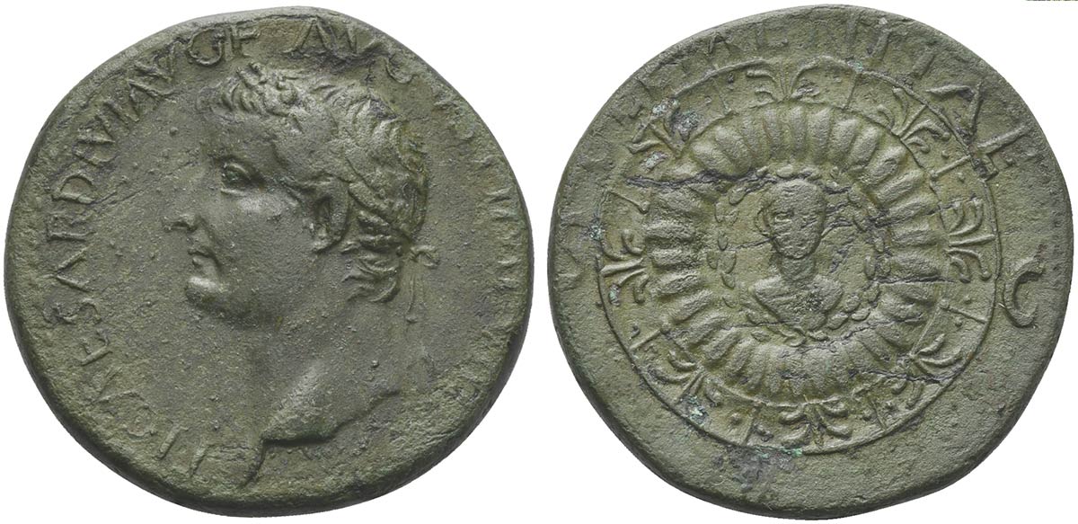 Lotto 1124 | Tiberius (14-37), Dupondius, Rome, 16-22. AE (g 15,12; mm 29; h 7). Laureate head l., Rv. Small bust of Tiberius within laurel wreath, the whole in the centre of a large shield with palmettes and raised petals. RIC 38. Scarce, gre