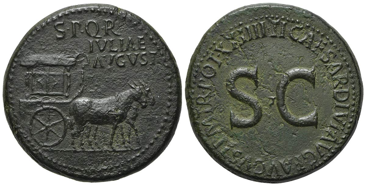 Livia (Tiberius, 14-37), Sestertius, Rome, 22-3. AE (g 26,21; mm 35; h 9). SPQR IVLIAE AVGVST, Ornamented carpentum drawn r. by two mules; Rv. TI CAESAR DIVI AVG F AVGVST P M TR POT XXIIII, Legend around large S • C. RIC 51 (Tiber