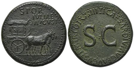 Livia (Tiberius, 14-37), Sestertius, Rome, 22-3. AE (g 26,21; mm 35; h 9). SPQR IVLIAE AVGVST, Ornamented carpentum drawn r. by two mules; Rv. TI CAESAR DIVI AVG F AVGVST P M TR POT XXIIII, Legend around large S • C. RIC 51 (Tiber